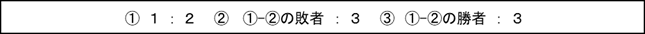| ・スコア表については以下のとおり表示する。 対戦スコア 左側数字 ドロー番号の数字が小さいチームの勝ちゲーム数 右側数字 ドロー番号の数字が大きいチームの勝ちゲーム数 例 A試合目の3:4の場合 左側=3のゲーム数 右側=4のゲーム数 |