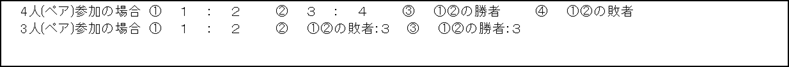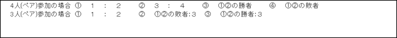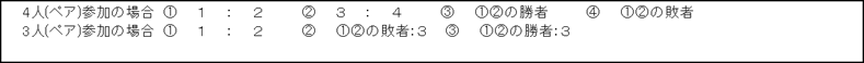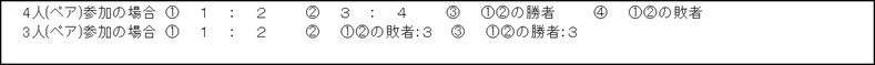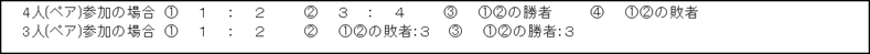 | ・ブロックでW.O(棄権)が出た場合 3組→2組 1試合(1試合の場合は、6:6タイブレークの1セットマッチとする) | ||||||||||||