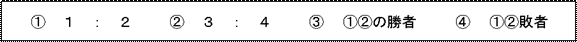 | ・スコアボードについては以下のとおり表示する 対戦スコア 左側数字 ドロー番号の数字が小さいチームの勝ちゲーム数 右側数字 ドロー番号の数字が大きいチームの勝ちゲーム数 例 A試合目の3:4の場合 左側=3のゲーム数 右側=4のゲーム数 |